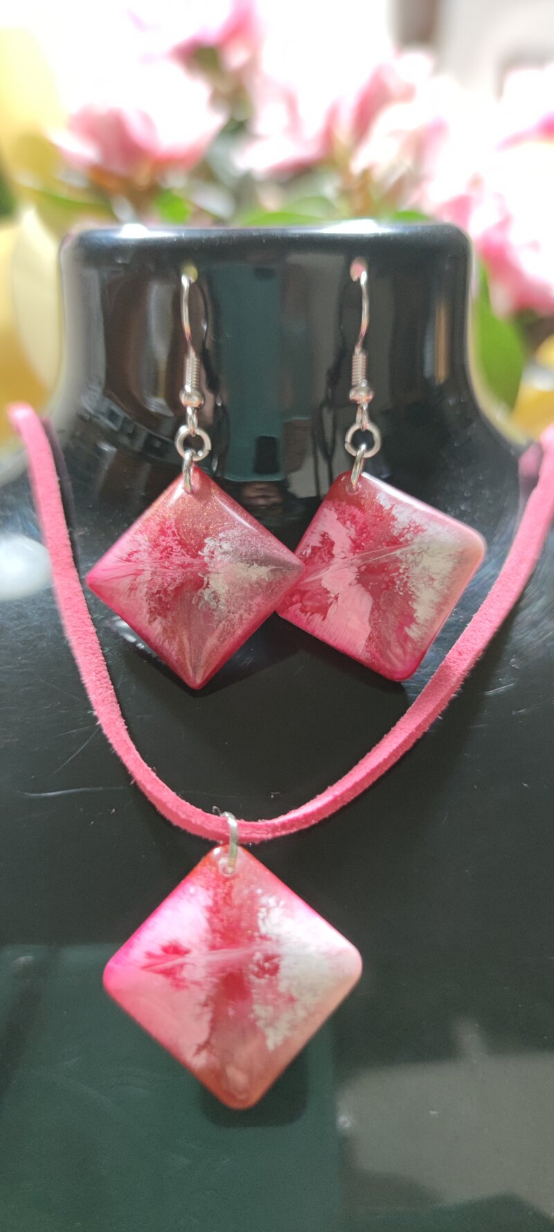 Parure quadrata sfumata Rosso/bianco,tecnica Petridish collana in camoscio rosa.